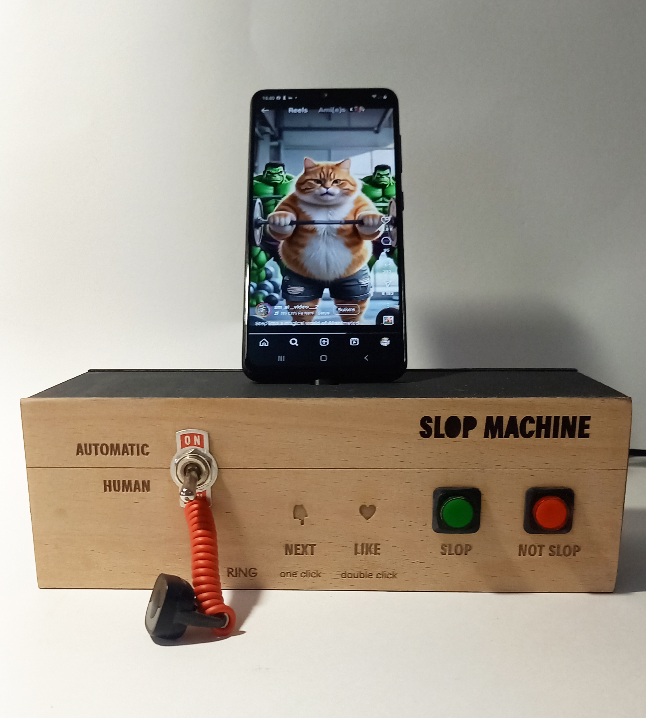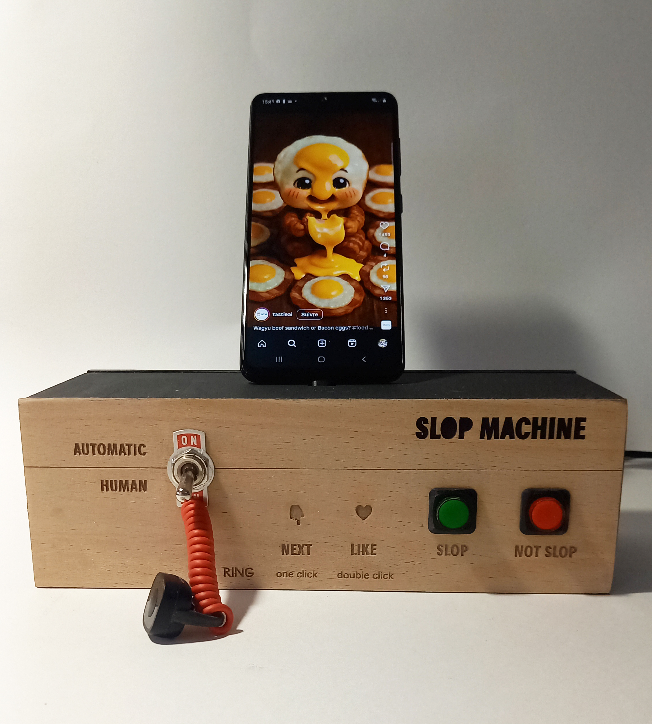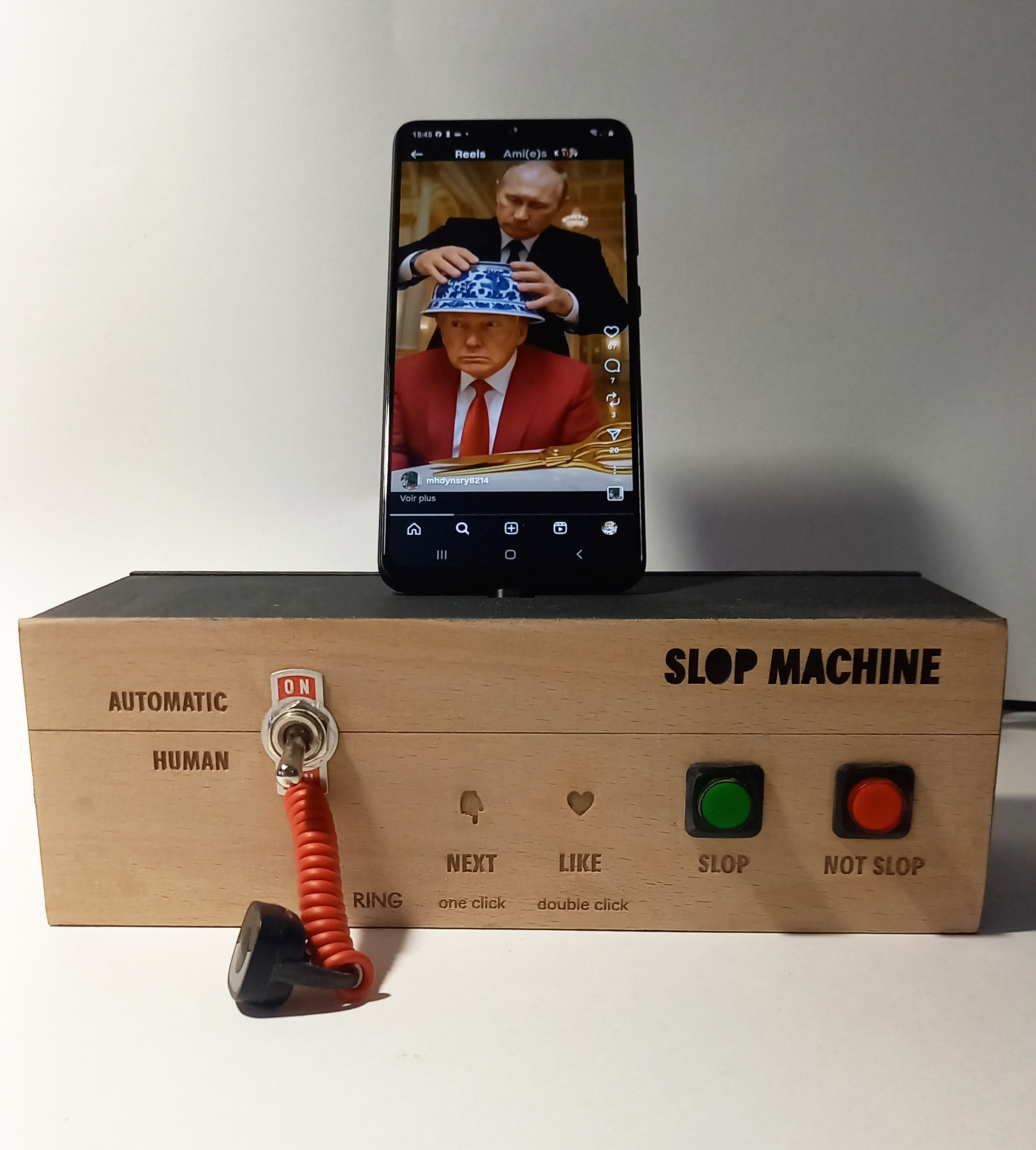 La Slop Machine est une installation qui met en lumière le Slop : contenu généré en masse par IA et diffusé à l’infini sur les réseaux sociaux.