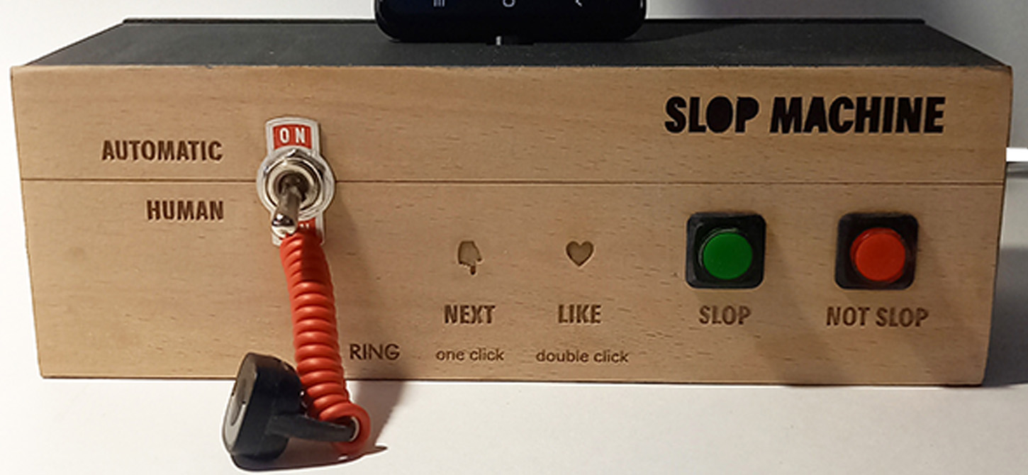 En mode humain, c’est au spectateur d’agir, de réfléchir à la nature du Slop et à ce qui le définit. Pour ce faire, il doit décider, en appuyant sur le bouton rouge (NOT SLOP) ou le bouton vert (SLOP), puis utiliser l’anneau connecté pour cliquer : un simple clic permet d’enchaîner le Slop suivant, tandis qu’un double clic permet de « liker » le contenu.